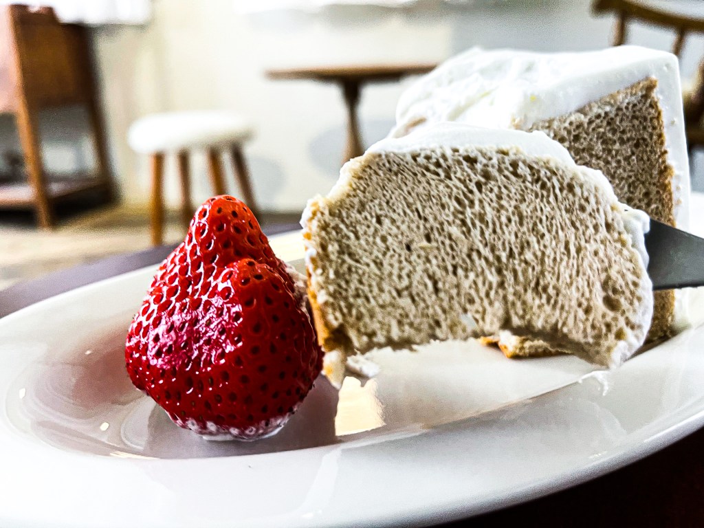 儘管位置不算多,也沒什麼兩人可對座的桌子,不過單純吃甜點喝咖啡,這裡正是種輕鬆舒服的風格。點了熱拿鐵,還有一份戚風蛋糕,來提振自己的心情與精神吧。