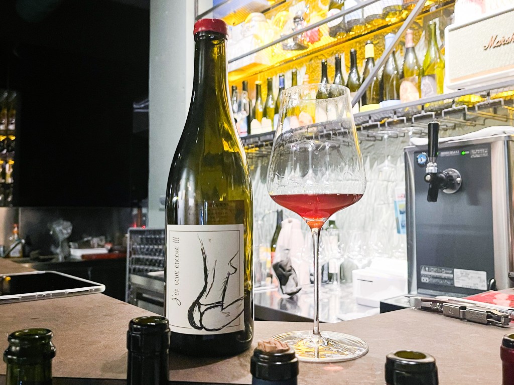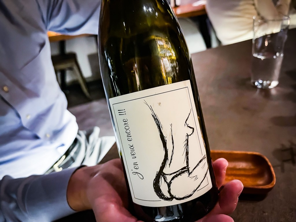 看了一下酒櫃上的酒款,這個美麗酮體的酒標,恰恰是和兩個男性,於是選擇這款Jean-François Ganevat – J’en veux encore(產地:France 產區:Côtes du Jura , 葡萄品種:50% Gamay, 50% Trousseau)的株羅區葡萄酒。