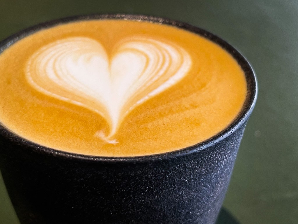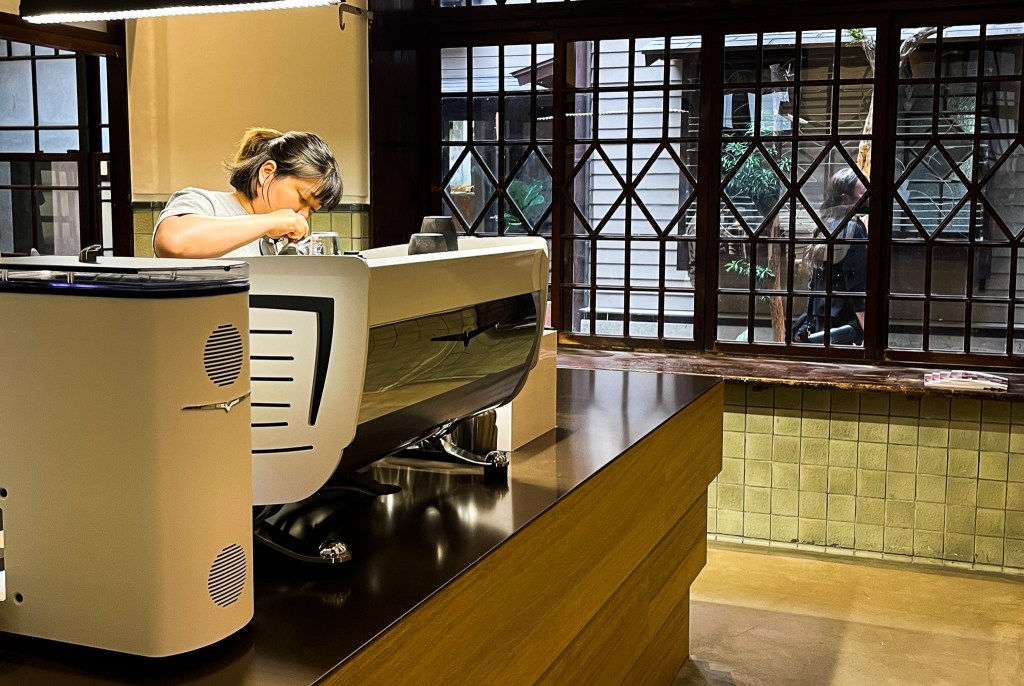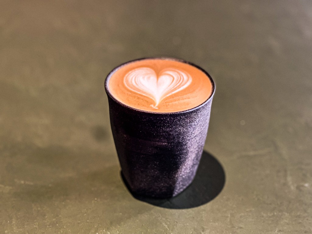 微醺的狀態下,來多一點刺激是最理想的,因此選擇一款中深烘焙豆。而眼前拿鐵呈現出如太妃糖泡沫,中段拉出一朵十分適宜的拉花。而眼前這特別的日式杯格外將拿鐵顯得一種老文化的新面貌。