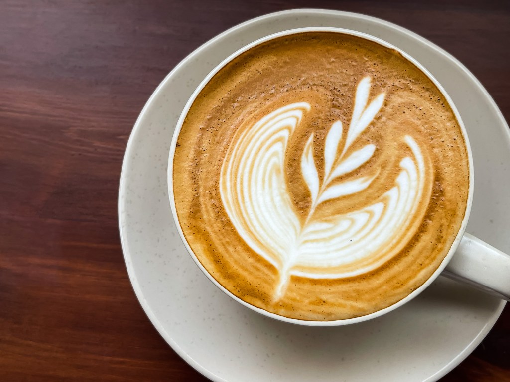 店裡是採中深烘焙豆來做這杯拿鐵。當拿鐵上桌時,其外表呈現的確實是展露中深熱拿鐵的實力。除了深焦色的泡沫,以及濃郁咖啡焦油和熱蒸奶泡沫的融合,形成焦濃如泥的泡沫,凸顯拉花的相對色樣。杯盤也襯托一種雅緻的風格。