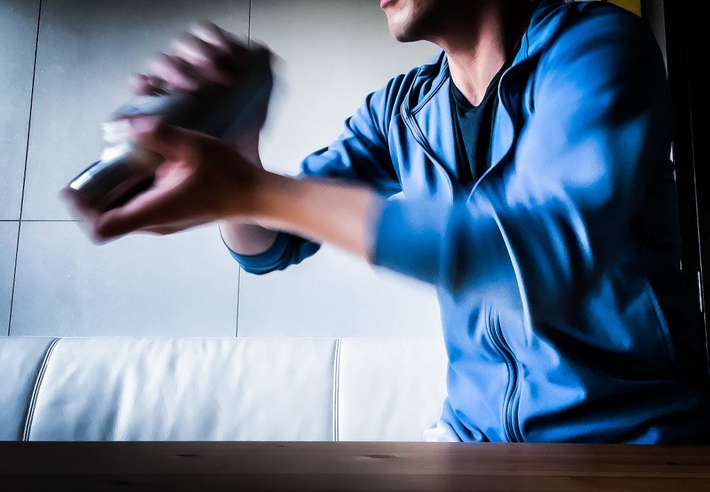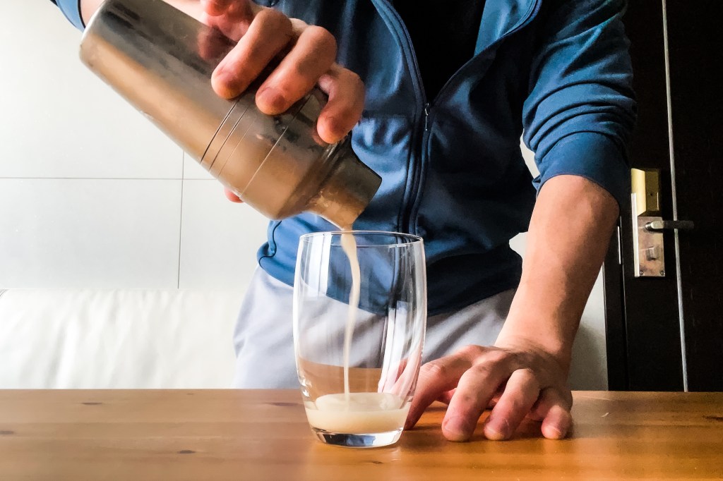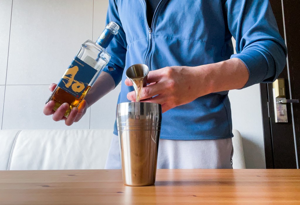 取出shake杯,依序先後加入檸檬汁、糖漿、調和威士忌、泥煤味威士忌、蛋白、苦精等等,最後加入冰塊,蓋起蓋子,開始搖盪吧,我大致搖了約30秒後停止。