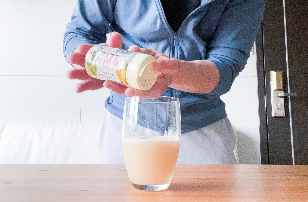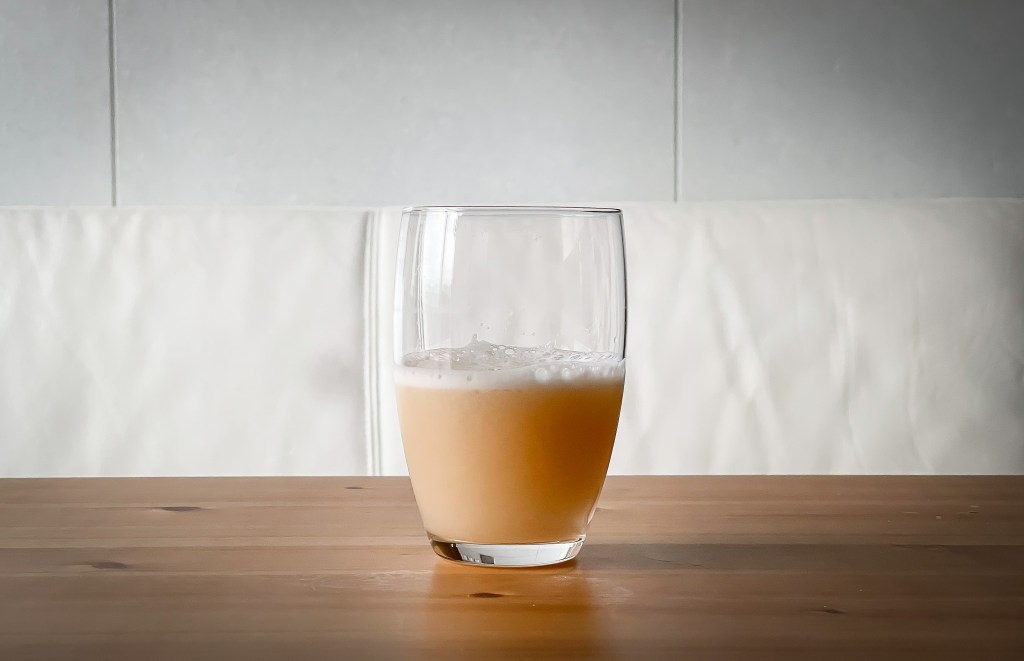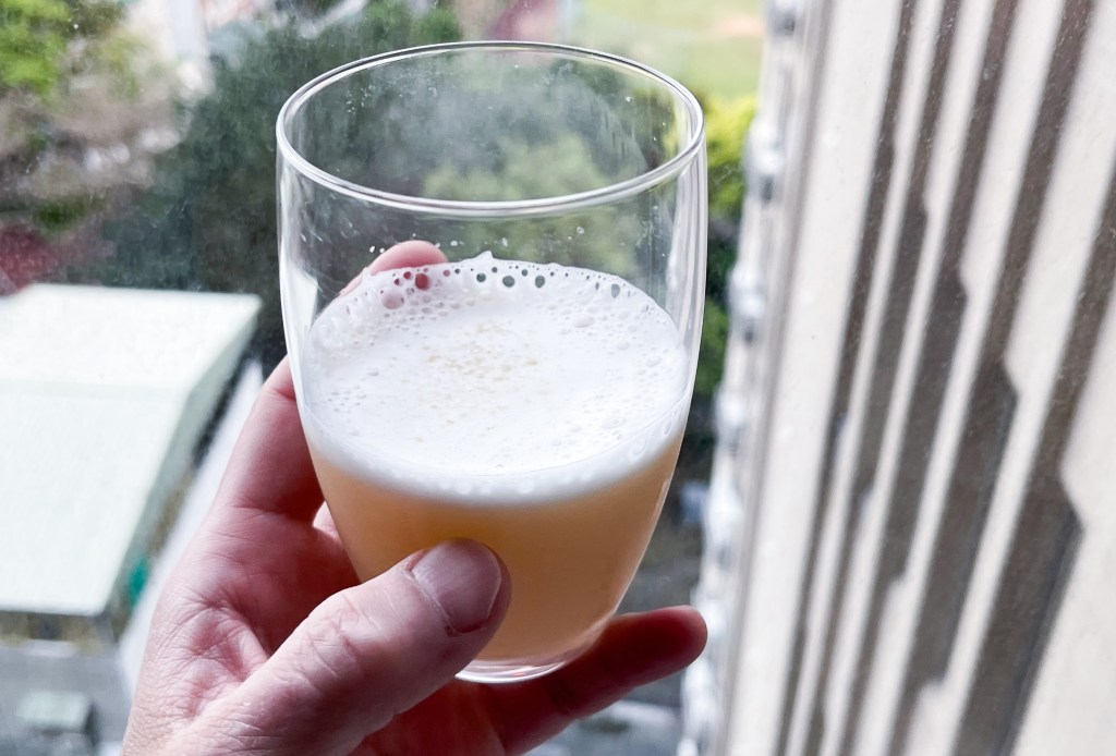 再取出酒杯,直接注入在沒有冰塊的酒杯當中。我完成後,取出了柚子鹽,拍打一下讓鹽輕鬆散落在蛋白泡沫上。