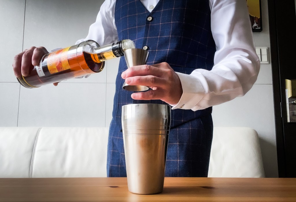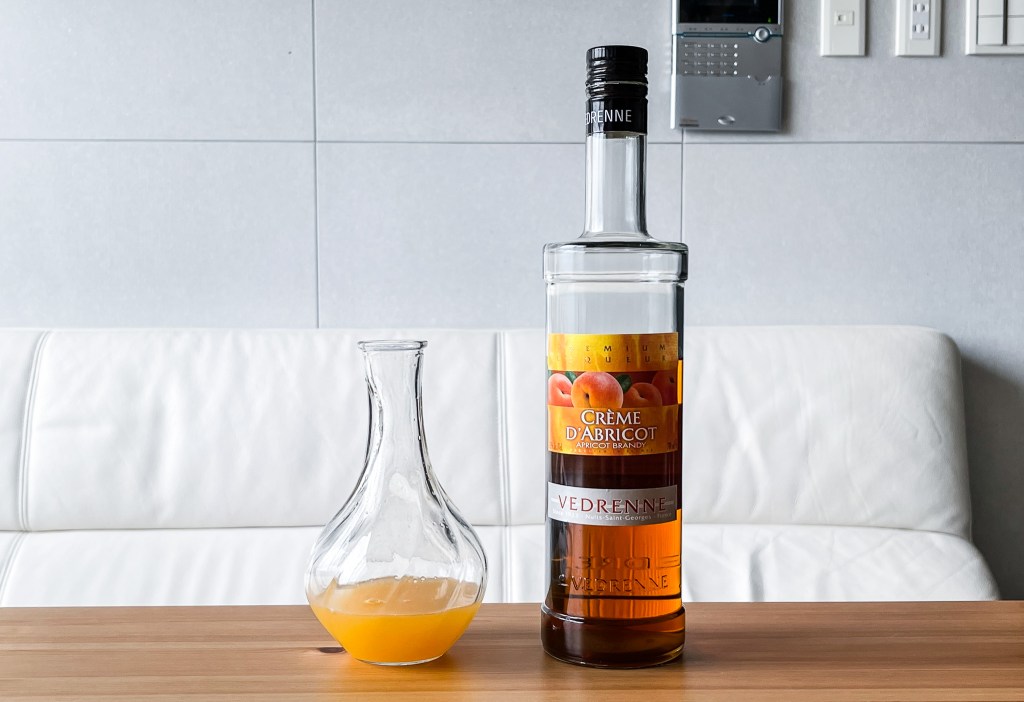 準備好加入冰塊的Shake杯,先注入50ml 但杏桃白蘭地接著再倒入榨好的、過濾好的柳橙汁,完成後直接搖盪,至少搖盪20喵讓冰塊與融合的就和橙汁融合。