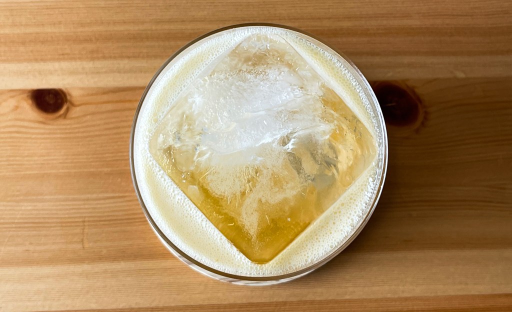 在準備好冰鎮好的酒杯,加入一顆大冰塊,接著將搖盪好的調酒直接注入。即完成今日早上的美味調酒Valencia。