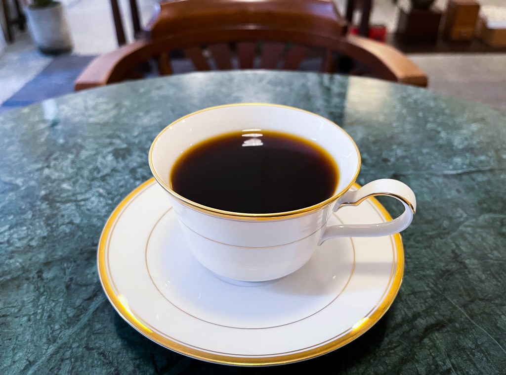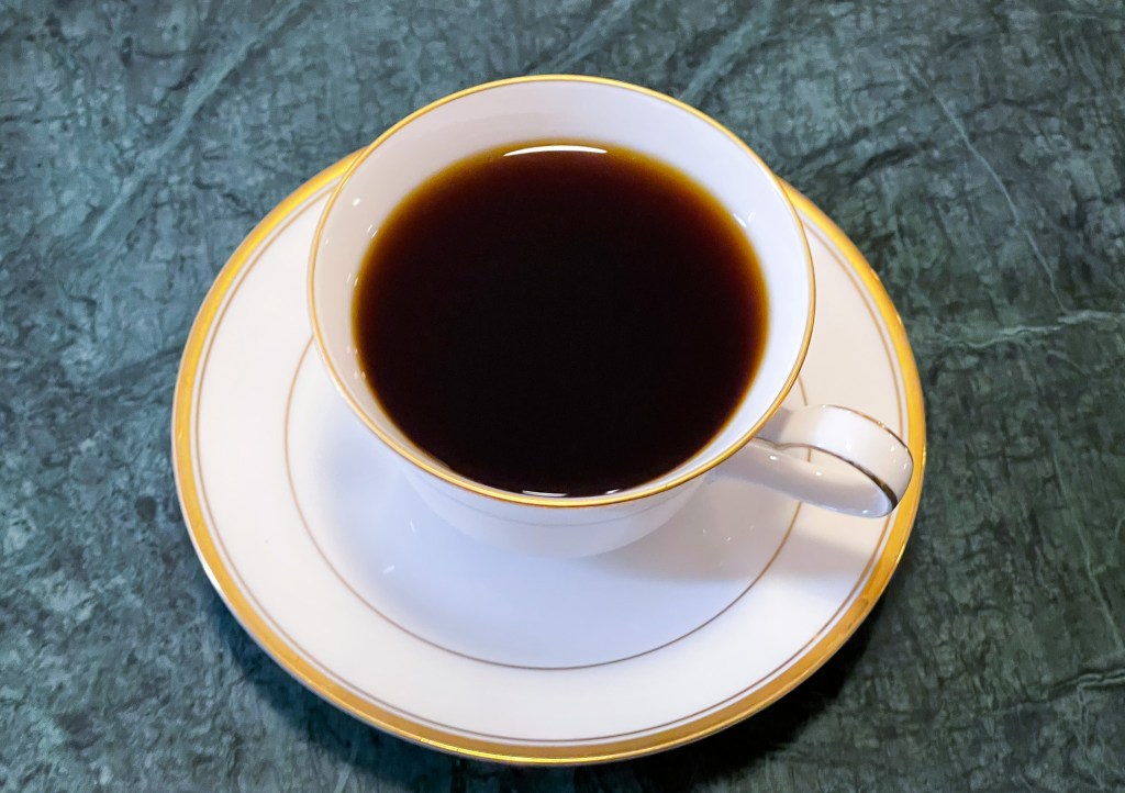 手沖咖啡,黝黑的咖啡色,裝載於英式咖啡杯盤裡更襯托本色,周圍的深褐色,入內的黝黑,表層浮著淺淺的咖啡油漬。