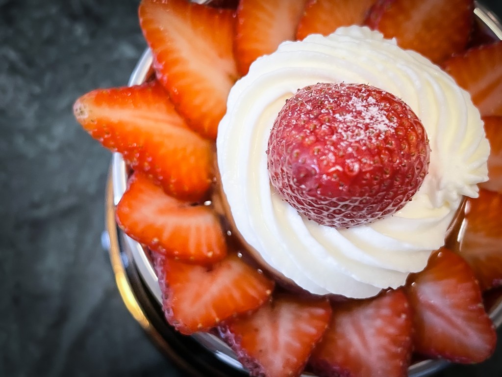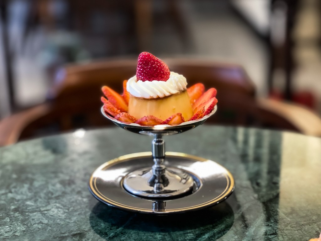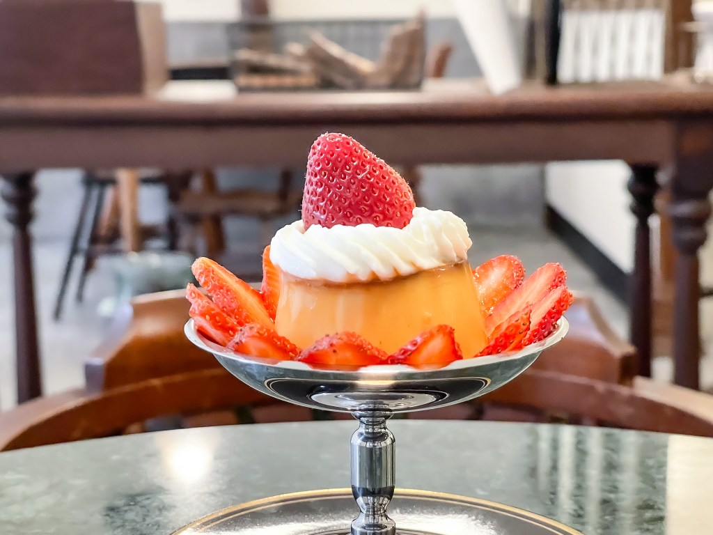 這塊草莓布丁的誠意感十足,除了精緻妖嬌的布丁之外,上頭襯上了一圈雪白而且口感輕飄飄氣味乳香的奶油,精彩的是除了頂上一顆撒沾糖粉的草莓,布丁盅周圍也有切片布丁的蓮花擺飾。
