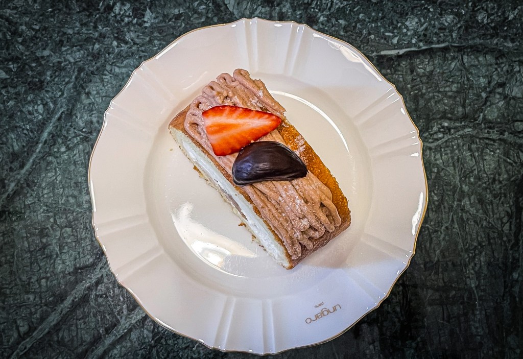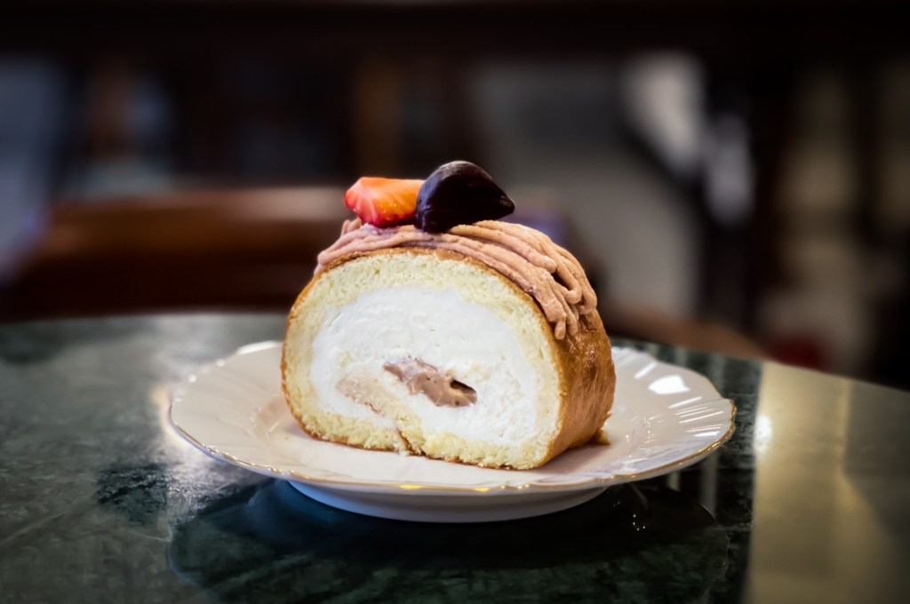 草莓、栗子、一條條擠壓的栗子泥,生乳捲夾著雪白奶油內餡同時也藏著栗子泥於其中。黑壓壓的栗子咬下有點果感,果脆感後是清香激甜,還有栗子微微的本色。