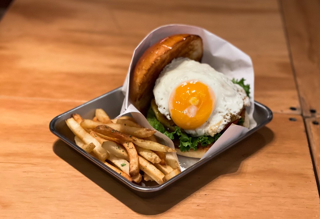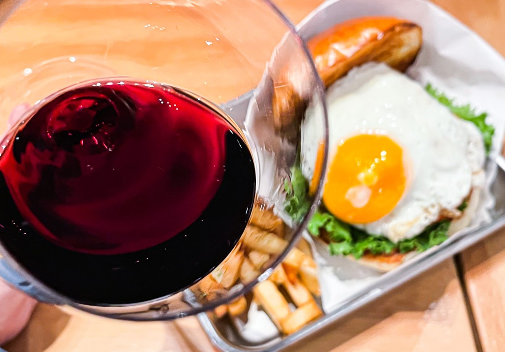 既然點了紅葡萄酒,那麼搭配的良品是澳洲漢堡(半熟蛋、牛肉、橄欖、以及薯條)。
