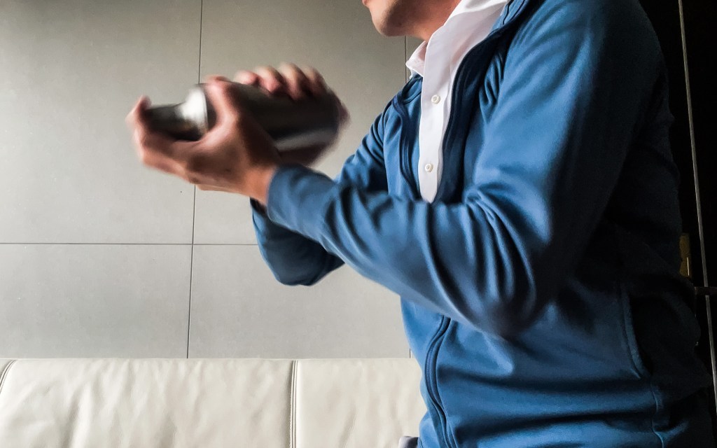 我陸續將酒倒入shake 杯裡,完成後加入冰塊,蓋上杯蓋,開始搖盪,我有大概搖了約有25秒後停止。此時的shake已經冰凍了起來。