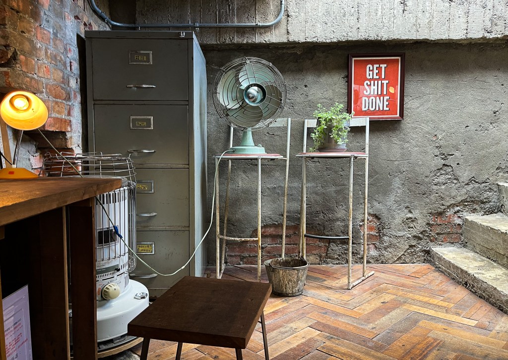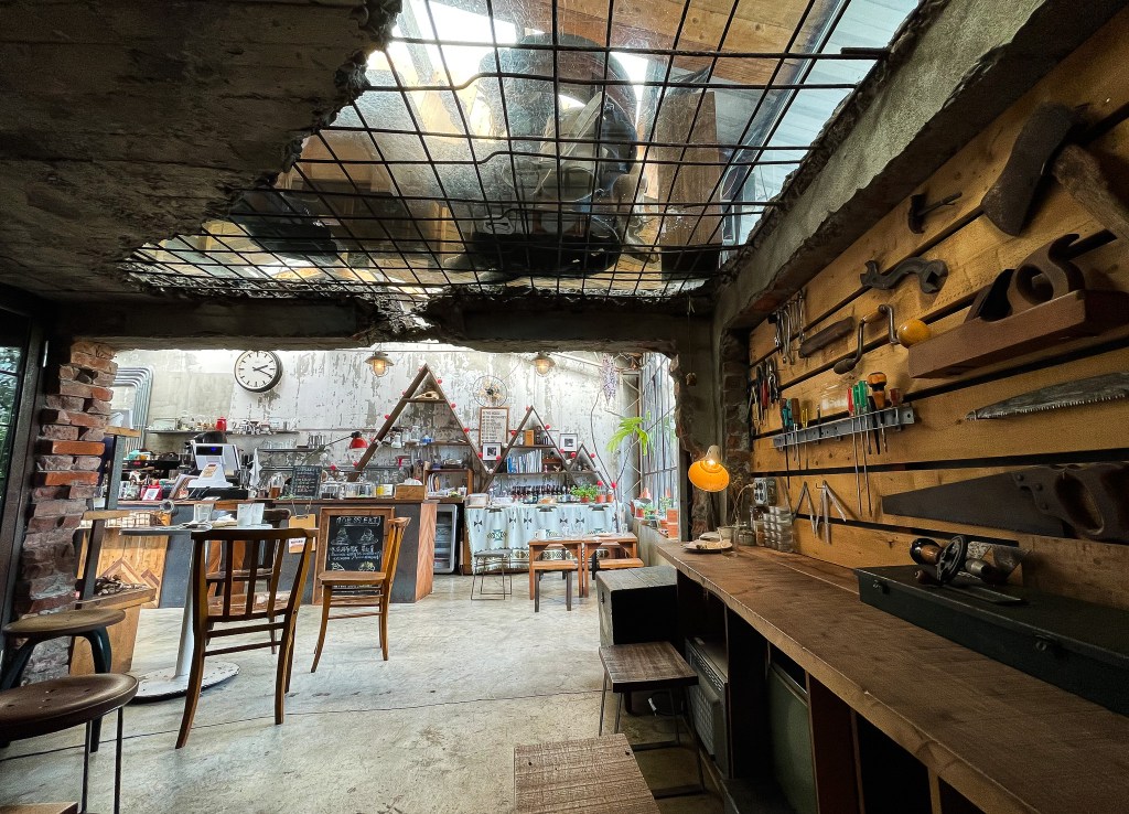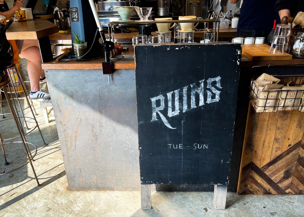 RUINS COFFEE ROASTERS ,是一處舊的廢棄修車店改裝的,店裡不是什麼時尚不是什麼韓系風格,也不叫做什麼工業風,其實就只是營造老工廠的修車處罷了。