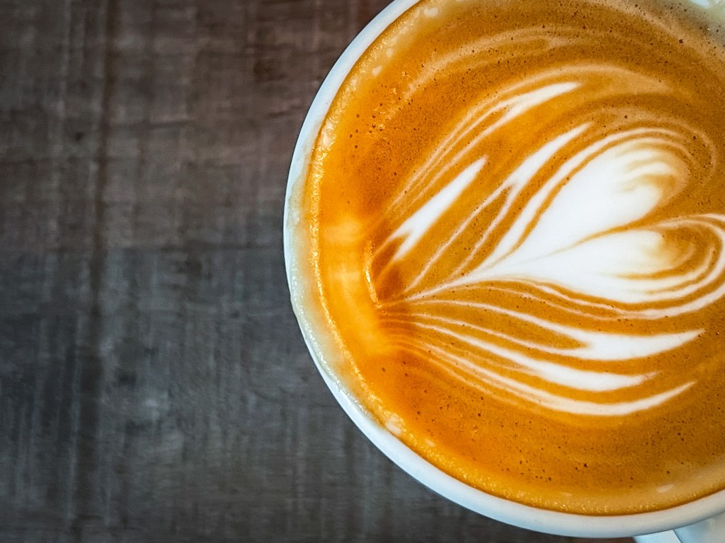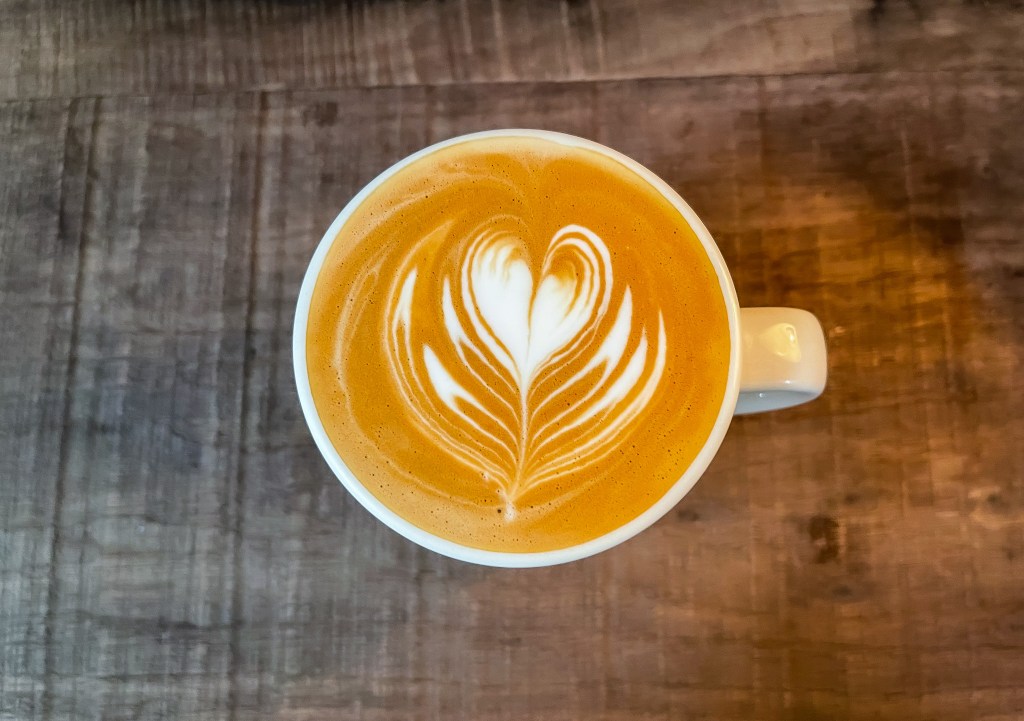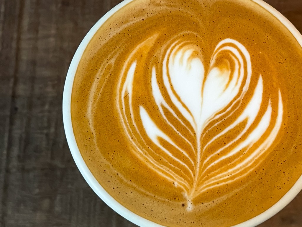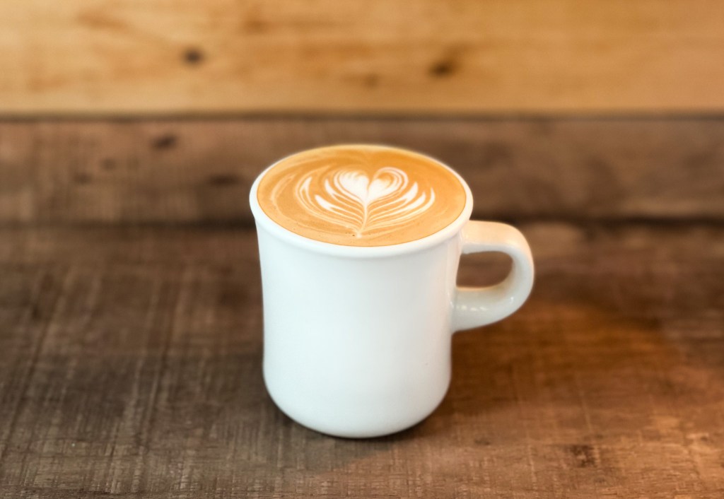 焦糖色咖啡泡沫,幾道細緻雪白蒸奶泡沫拉出精緻俐落的心型拉花,泡沫紮實持久濃郁。