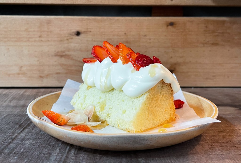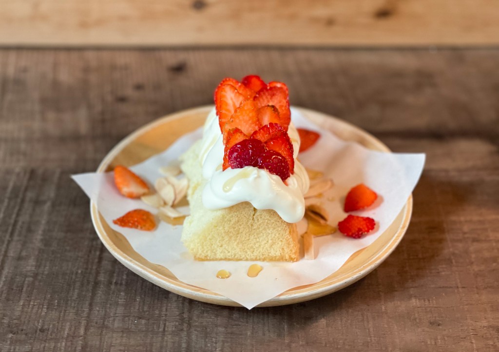 草莓切片、打發奶油、杏仁果、襯在原味戚風蛋糕上,還別出心裁的添加蜂蜜,增添甜美氣息以及風味。