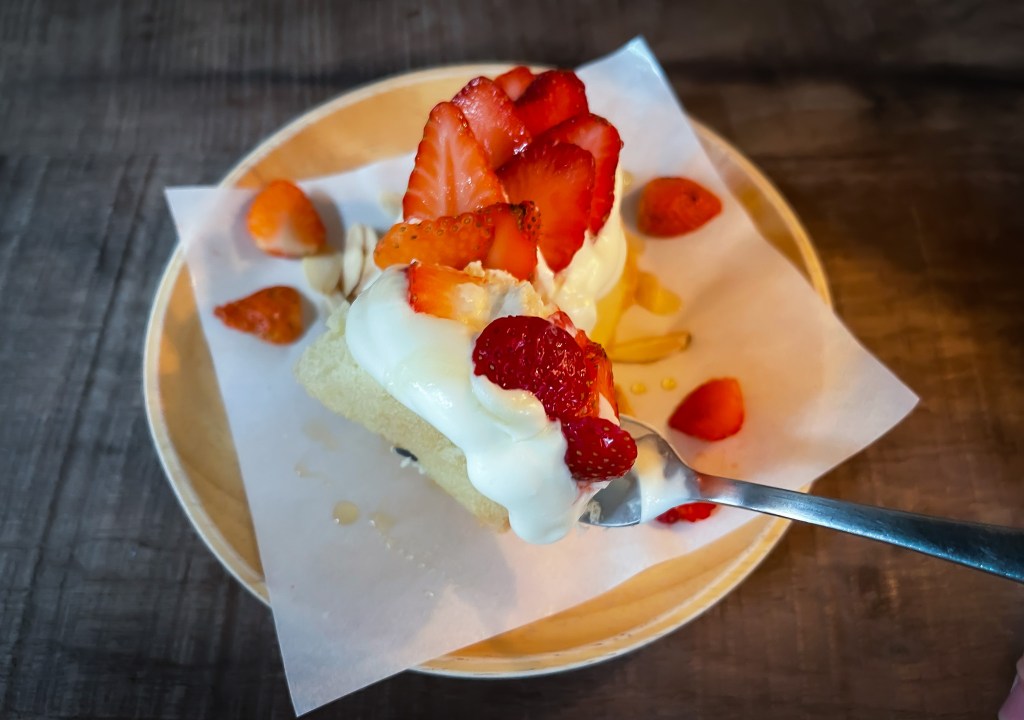 切下一塊吃下,咀嚼有Crispy 的感覺,蛋糕裡也藏著杏仁果,蛋糕輕彈,奶油帶點香甜,草莓微酸,帶點輕微的草莓香,一起吃下感受則沒那麼鮮明。