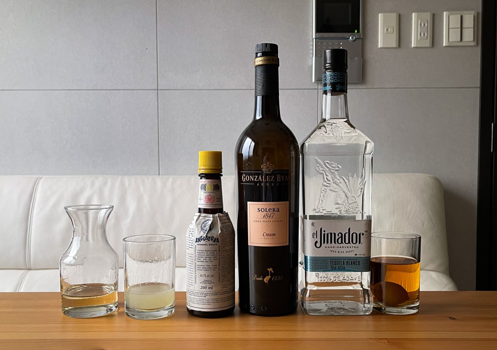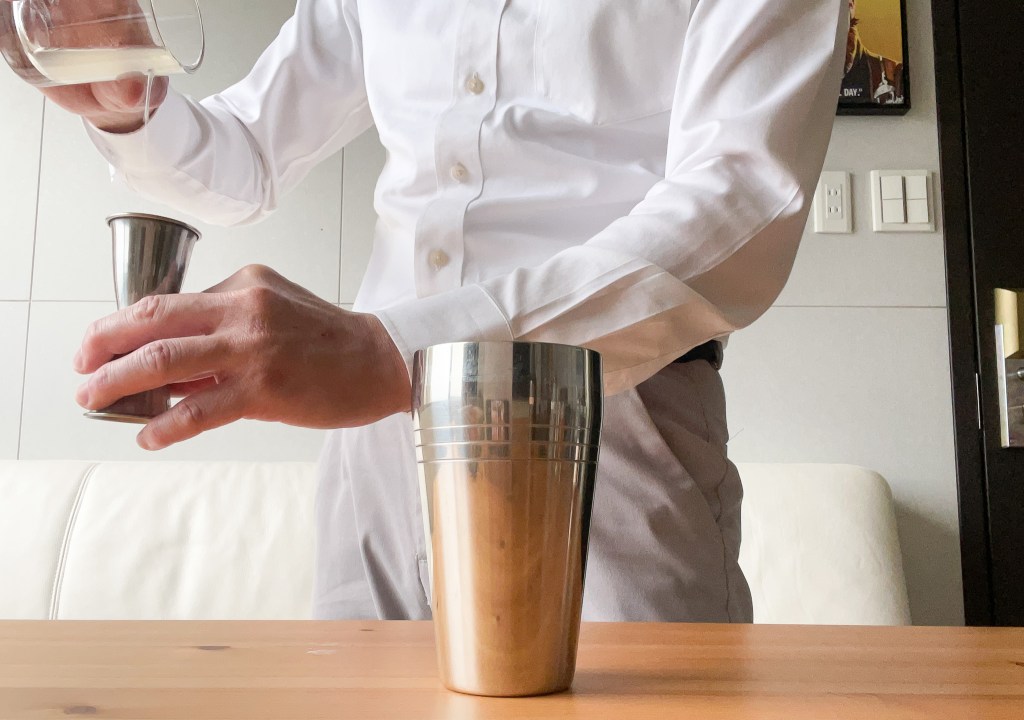 我準備好一只Shake,並依照順序加入上述的龍舌蘭、梅酒、雪利酒、檸檬汁、糖漿以及苦精,然後蓋起杯蓋並且開始搖盪,也大概20秒左右後停止,取出杯子並加入冰塊。
