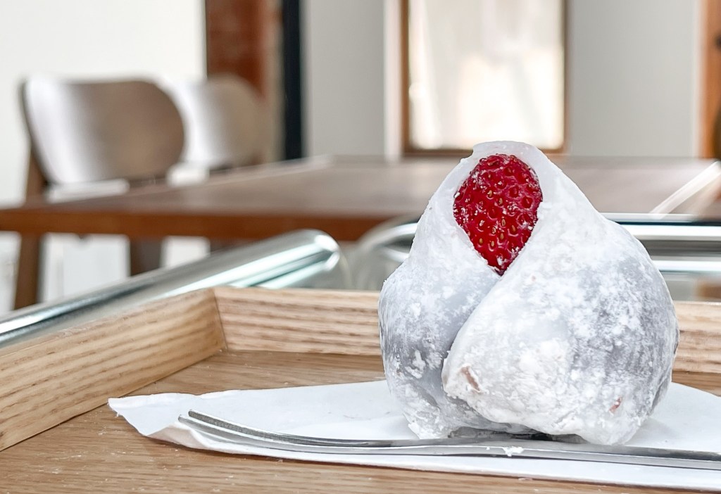切開吃下,香甜的草莓氣味奔放,切下時衝出就是迷人。咀嚼香甜的豆泥十分愜意好吃,外依麻糬雖然厚了些但恰如其分的可口。