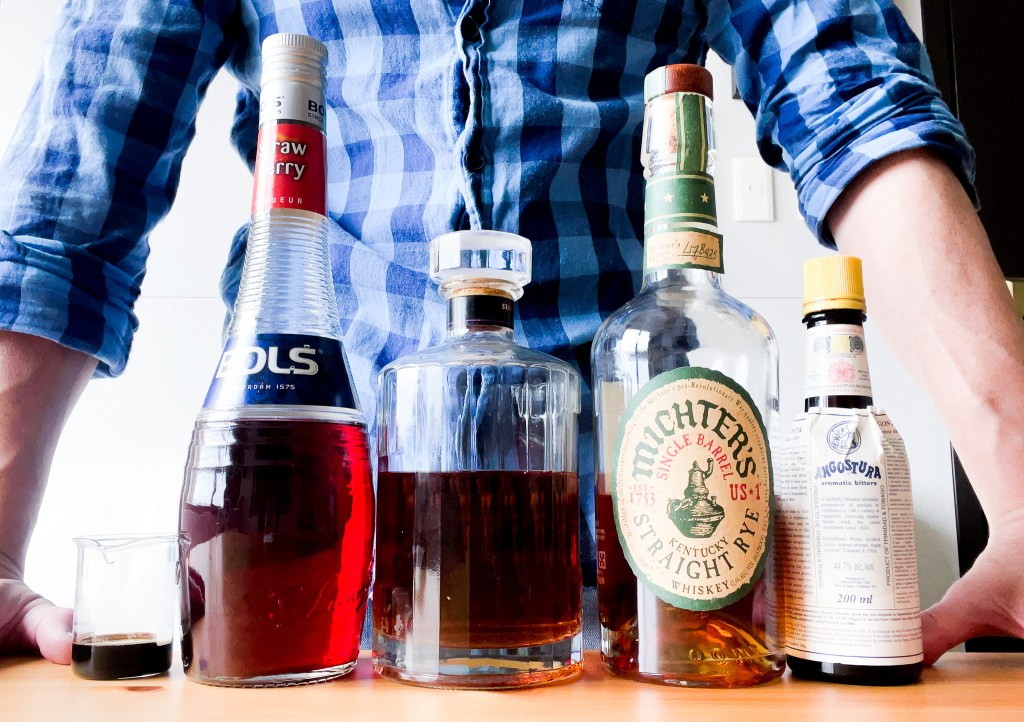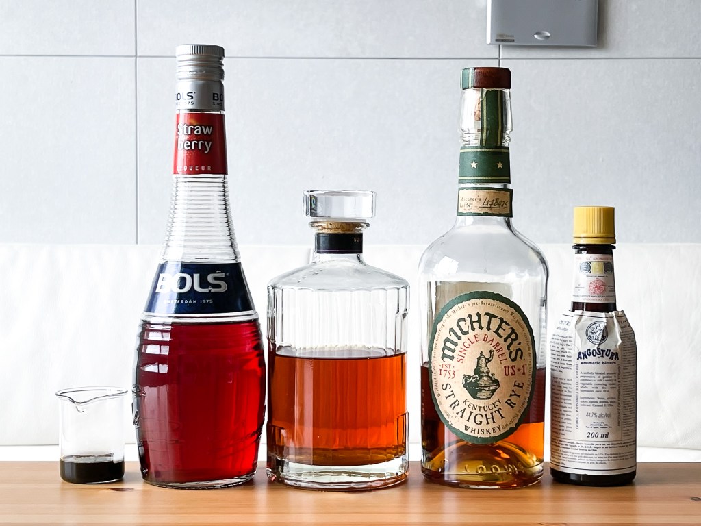 我起床後便開始準備食材,除了既有的草莓威士忌外,我也添加一些裸麥威士忌,以及有點草莓利口酒作為設計概念,較為麻煩的是我用黑糖煮成蜜作為調整的甜味。