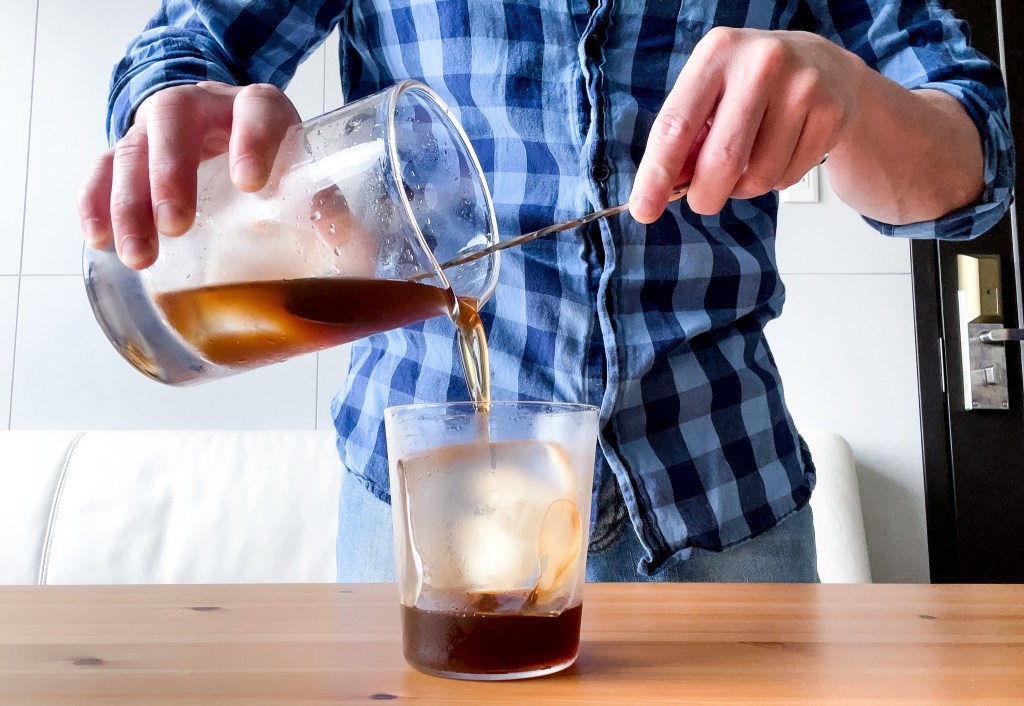 準備好攪拌壺,然後分別倒入草莓威士忌、裸麥威士忌、草莓利口酒、苦精、黑糖蜜厚加入冰塊然後攪拌,除了讓酒冰鎮外,此外也靠著緩緩融合化的冰來調整酒的厚度以及勁味。因此,攪拌到一個程度後,要試一下,沒問題後再倒入準備好的威士忌杯中。