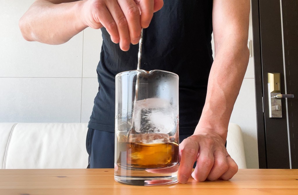 不過調和是有個前後次序,先是Whiskey 、Syrup 、Coffee Liqueur 後攪拌融合,然後加入冰塊再攪拌使其冰鎮。