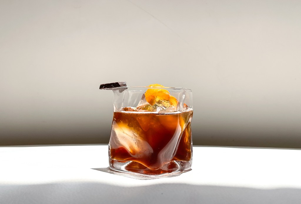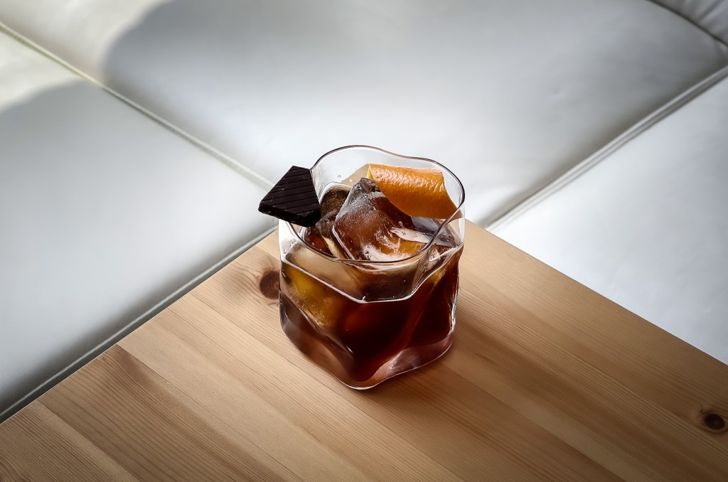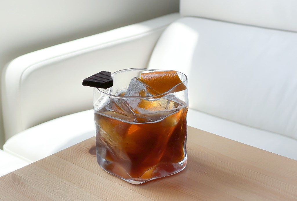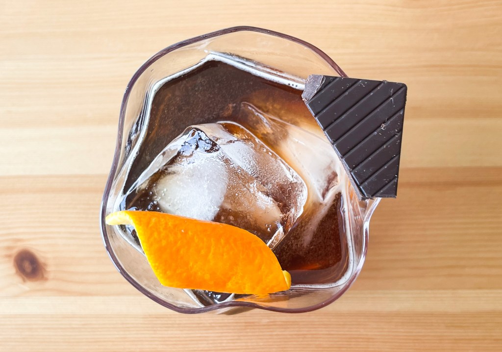 再加入咖啡苦精,然後再持續攪拌,差不多後將杯子取出加入冰塊並置入調酒,完成後倒入約10ml的氣泡水,此時在用攪拌棒稍微提拉讓氣泡水和酒混合,然後取出準備好的Orange Slices 並擠上油,再放上一塊巧克力。