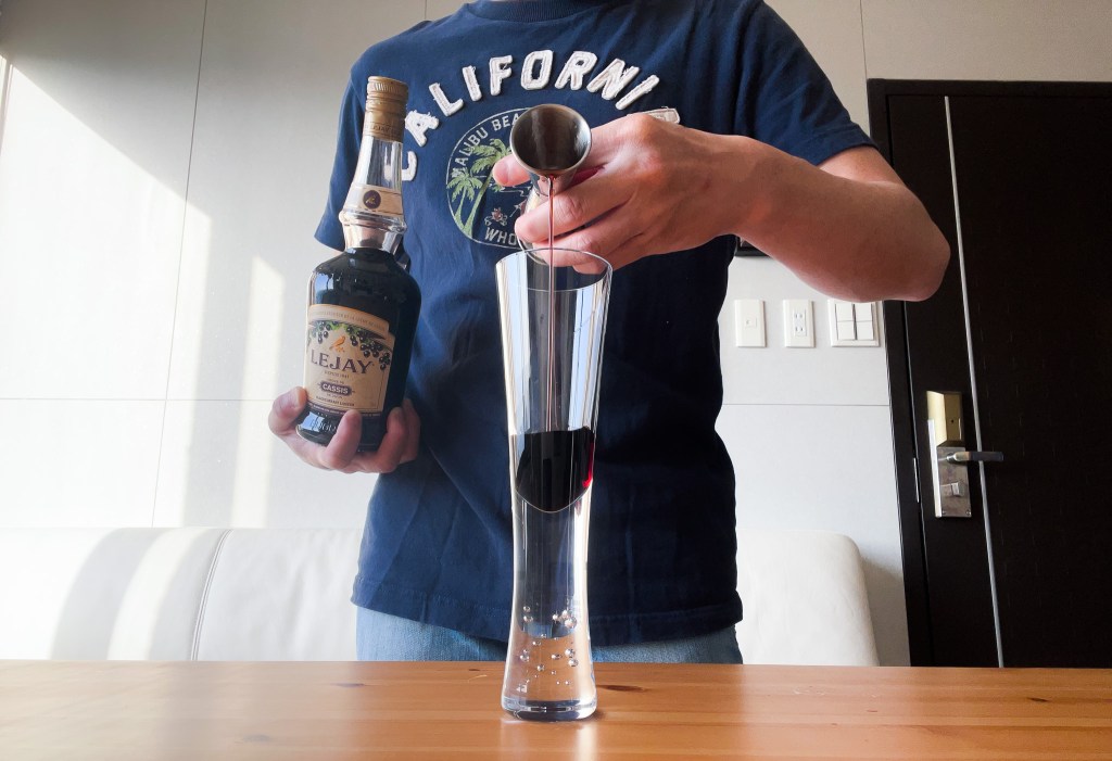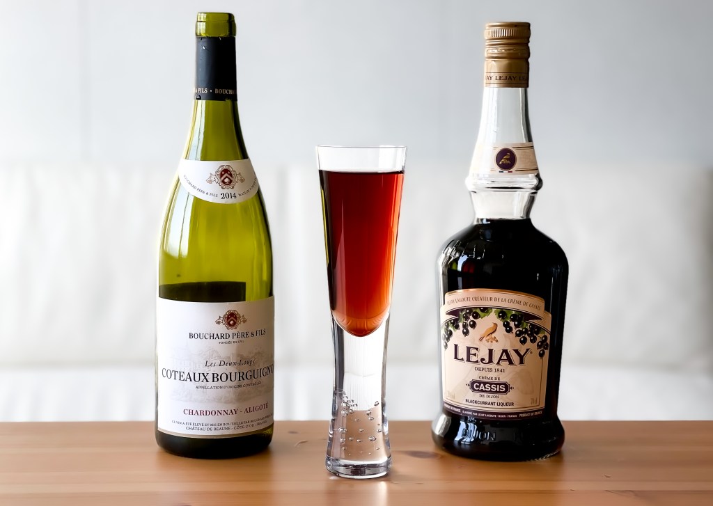 調制法相對簡單,直接注入杯子即可,先倒入25ml 黑醋栗香甜酒,再注入100 ml白葡萄酒,再以攪拌棒稍微輕輕攪拌融合,再擠上些檸檬油為一早增添點香氣,提振精神。