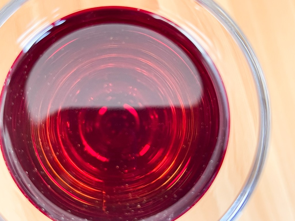 色調,感覺像是紅酒,稍稍有年紀一點的布根地黑皮諾,形成一種酒紅色,一種深紅寶石,平靜酒面優雅。