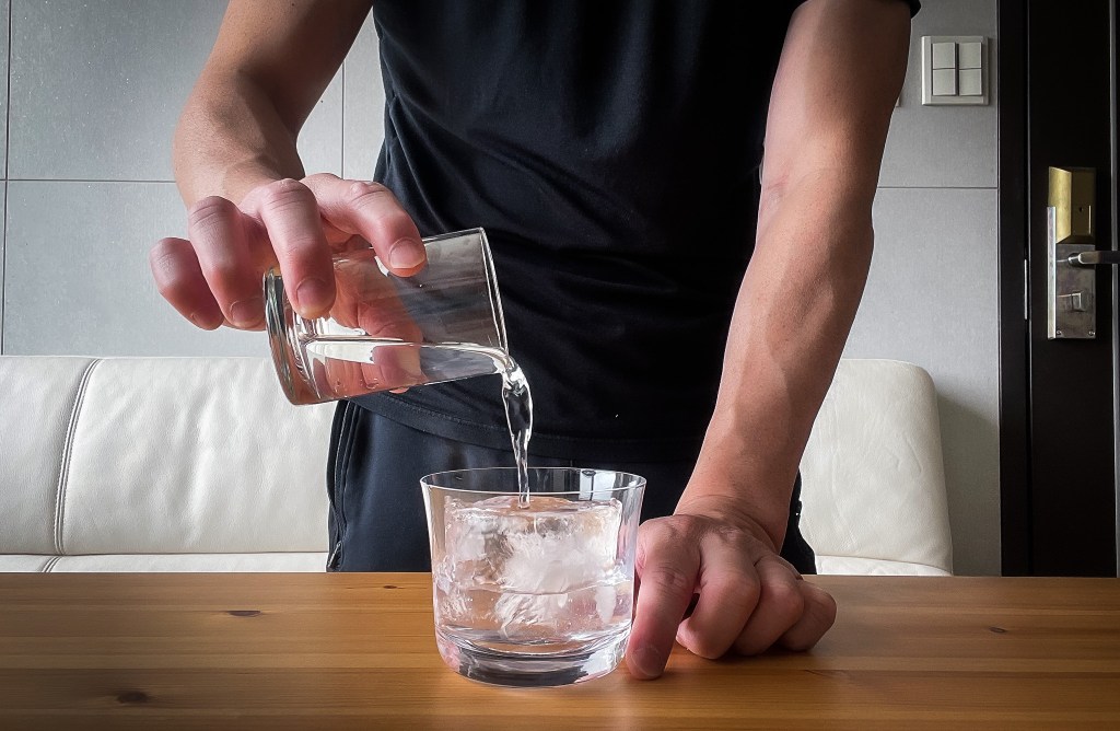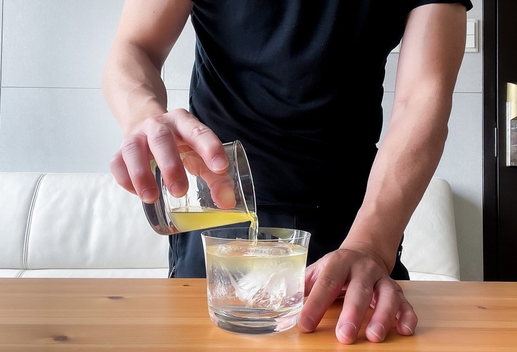 接下來,準備杯子並加入冰塊,然後陸續加入濃縮的通寧水液、以及綠茶琴酒,即完成這一杯看似簡單但過程得要點時間的Ujicha Tonic。