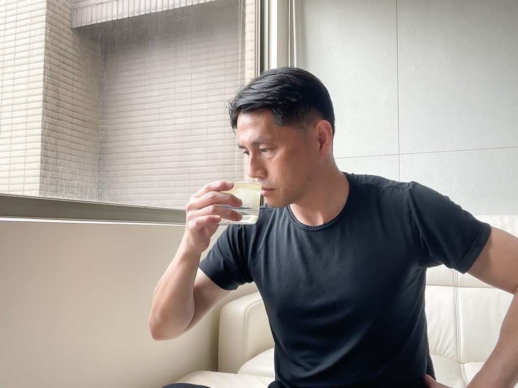 氣味,明亮乾爽的琴酒氣味,也許調和了綠茶不如原酒的激香,但有點茶澀感也是不錯的反應,至少沒有太過難以接受的感覺。