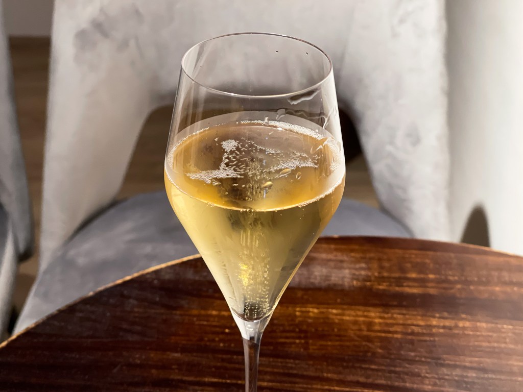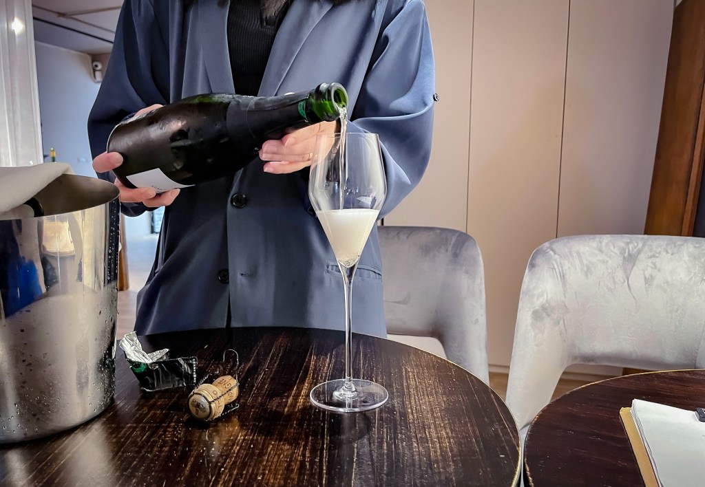 好的,漂亮的店主在練習酒唱歌的同時,幫我開了香檳並注入香檳杯中。這顏色看起來非常優雅美麗,此外,也看到標準開香檳的方法,很棒。好的,接下來就是我的獨享時光。