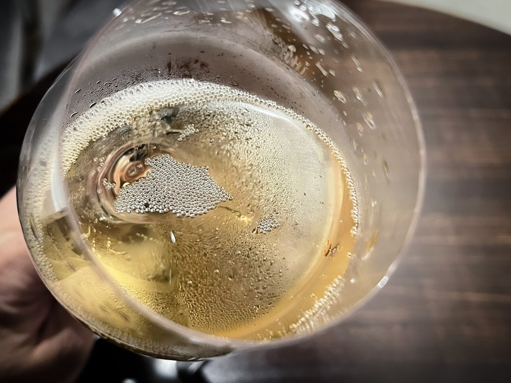 尾韻,乾澀黏稠的乳酸感,感覺有層膜在舌頭上,很美好的一款香檳。