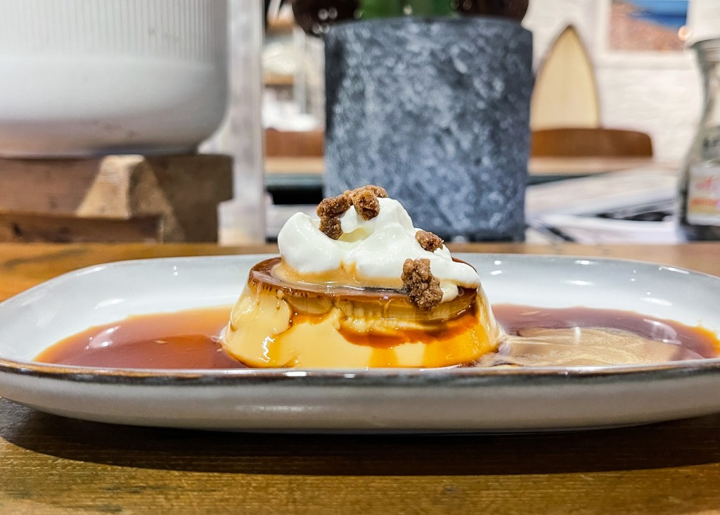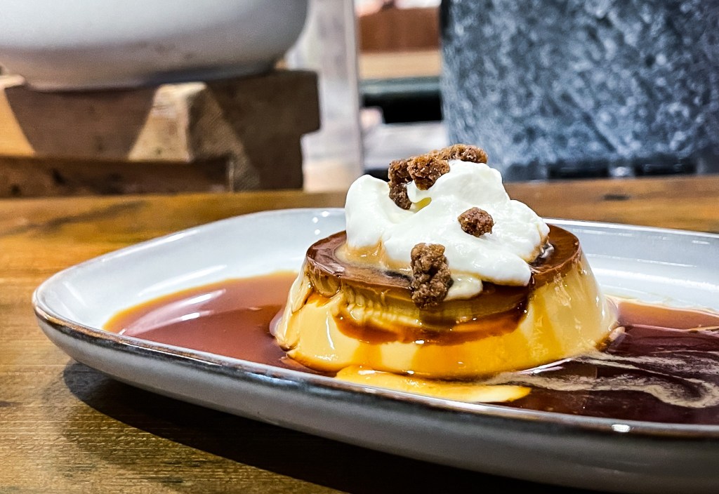 軟綿綿的布丁,奶油以及一些肉桂香的糖塊,坐臥在長盤中焦糖漿泊中。
