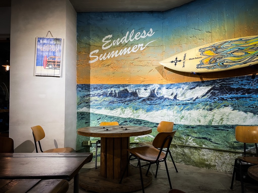 是的,有療癒到,坐公車到一半突然的行動,確實沒有白做判斷。來到這間相當熱帶的、海上運動感的咖啡館,確實達到目的,一個緩和精神舒緩肌肉痠痛的壓力,還有點小輕鬆與悠閒感。