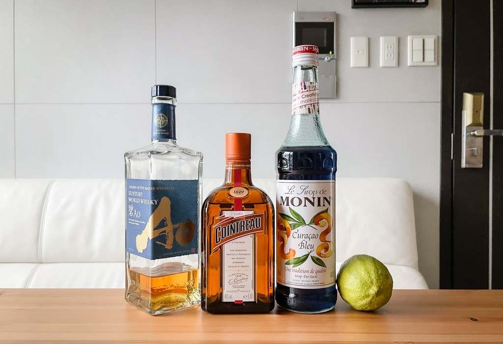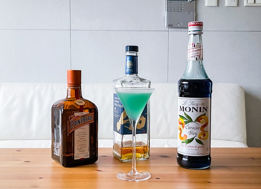 我翻了一下調酒書,選擇了一杯口味適合現在,顏色挺洋溢的雞尾酒,它叫做國王谷。有香氣甜美的君度橙酒還有藍色糖漿,恰好消消這款使用不多的糖漿吧。