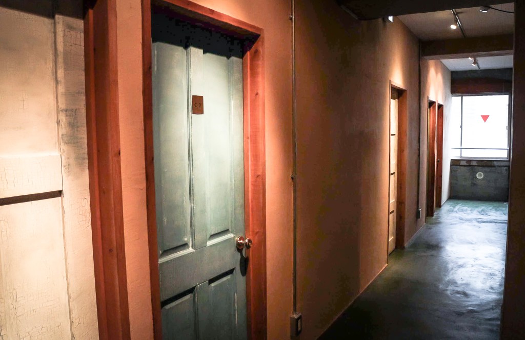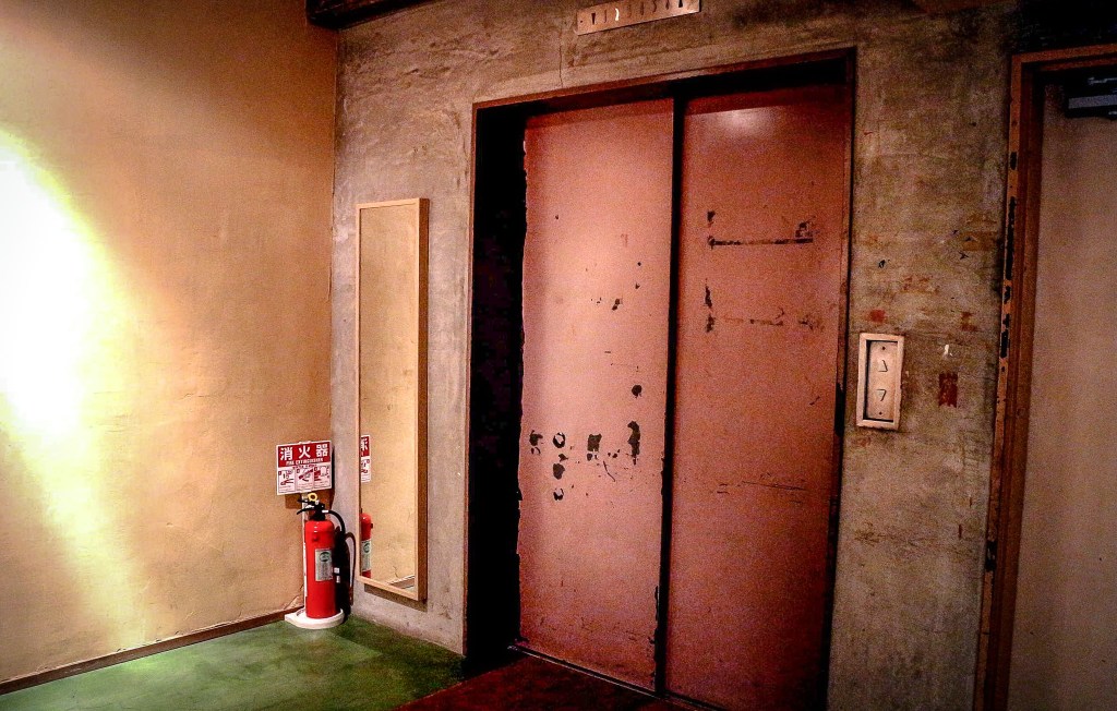 從咖啡館一樓的倉庫型電梯搭乘,這時真能感受所謂多年的歷史,這種電梯就是那種標準老倉庫型的電梯,運貨補貨用的那種,我搭乘到四樓,而我的個室則是走廊到底,能夠看到一半隅田川的位置。