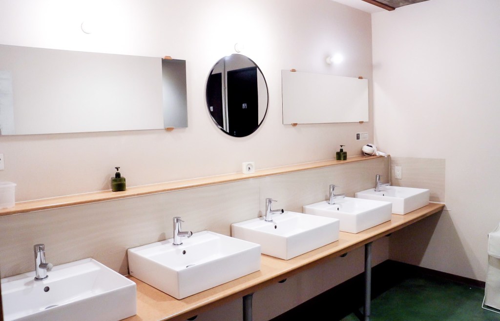 來到公共空間,進門後可以看見一整排洗手台,不過還好不像是軍中那樣開放式平台,而是個別的洗手台與鏡子。再往裡走首先會看見廁所,而廁所的右手邊即是浴室了。清潔人員定時會於早上及下午時段整理,自己遺忘的盥洗用具,他會幫你集中在一籃子中。第一次的經驗總是有趣,自己也從來沒想過會來住青年旅館,原來這麼刺激,這麼的公眾化。
