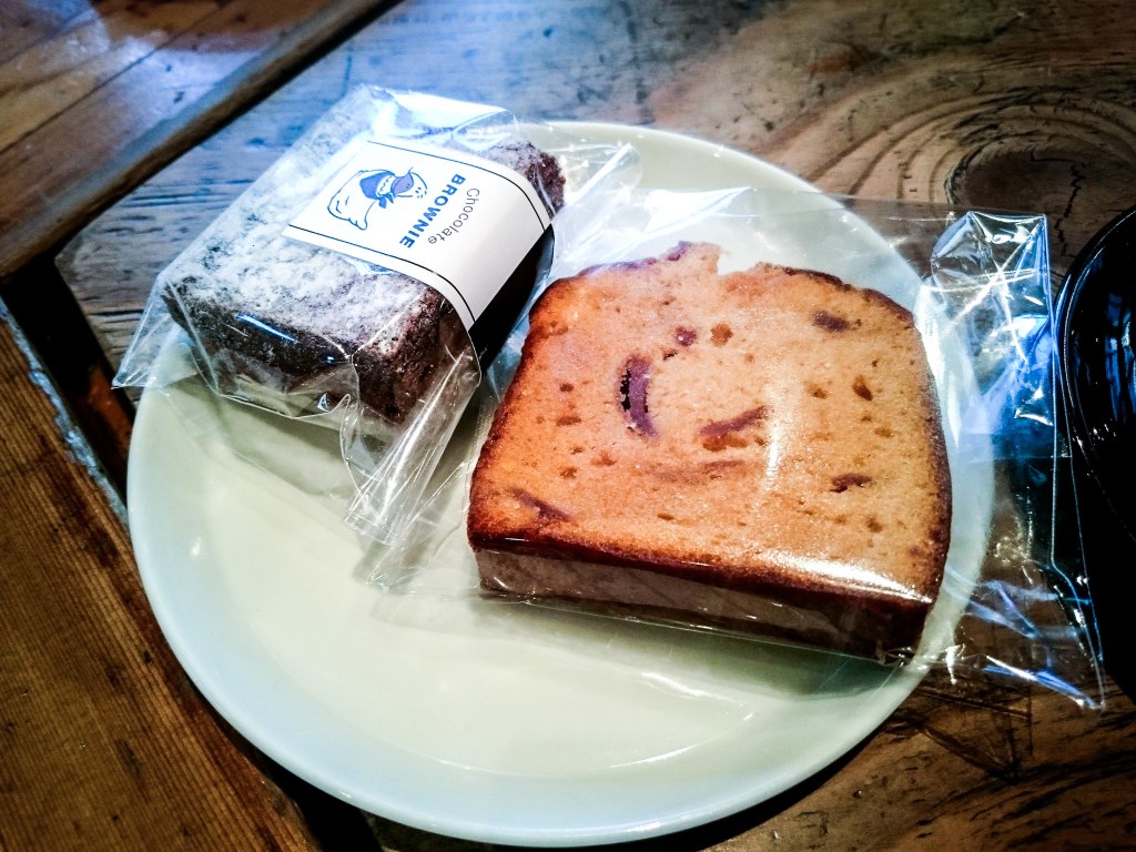 因為明日的行程要到新潟滑雪,中午用完午餐,得先回到飯店裡,也必須先將我的行李搬到明日要住的地方。利用還有剩餘的時間,我坐在Nui裡點了一杯熱拿鐵以及一塊巧克力布朗尼蛋糕與橙香的pond cake而可惜的是不是現做的,是透明紙袋包裝的,可隨取使用。