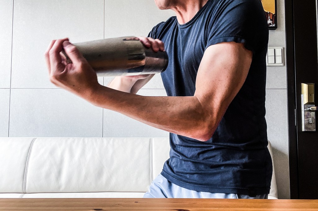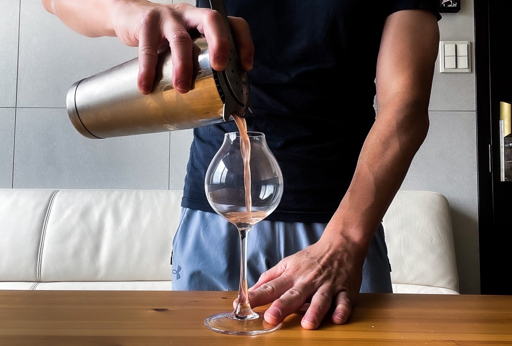 完成後,以濾冰器銬住杯口,取來酒杯將酒注入,即完成這一杯香甜帶勁的雞尾酒。