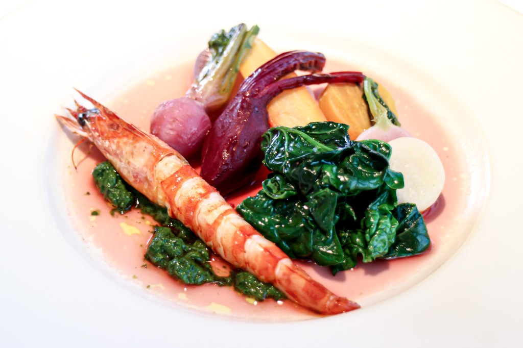 以季節蒔蔬如菠菜、甜菜根、蘿蔔、葡萄製作的湯汁以及蒸的日本明蝦。從這些菜餚明顯感受出主廚所用的食材偏好,感覺樸實實在不花俏和多層次,感覺比較想家常菜餚。不過處理的手法細膩,蝦肉厚實沾上些醬汁滿美味的。