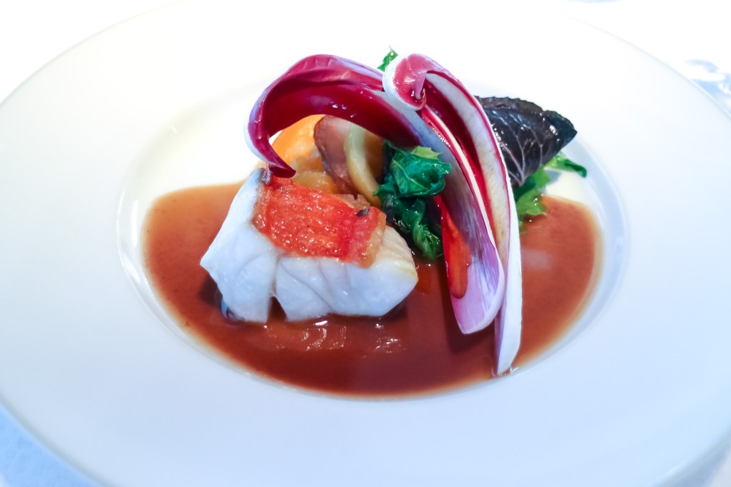 第6道菜是魚料理「Kinmedai fish, onion and orange, red wine-citrus sauce」
