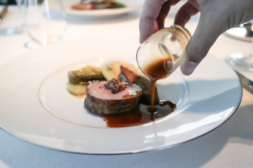 我選擇的主菜是烤羊腿肉佐茴香大蔥以及淋上主廚製作的肉汁。也許就如介紹所述的小島景主廚喜好用鎌倉的蒔蔬作為料理,這道主菜烹調的非常滑嫩,肉料理都會配置特別的餐刀,在取肉時犀利易上手,約七分熟的圓柱狀羊腿肉,還約見粉色半生的肉色,同時顯現鮮嫩,一塊塊取下食用搭配主廚佐上的肉汁,在嘴裡可直接感受roasted所帶來的香氣。其實搭配白葡萄酒,也沒什麼不好,只是果香味稍稍被壓抑了。
