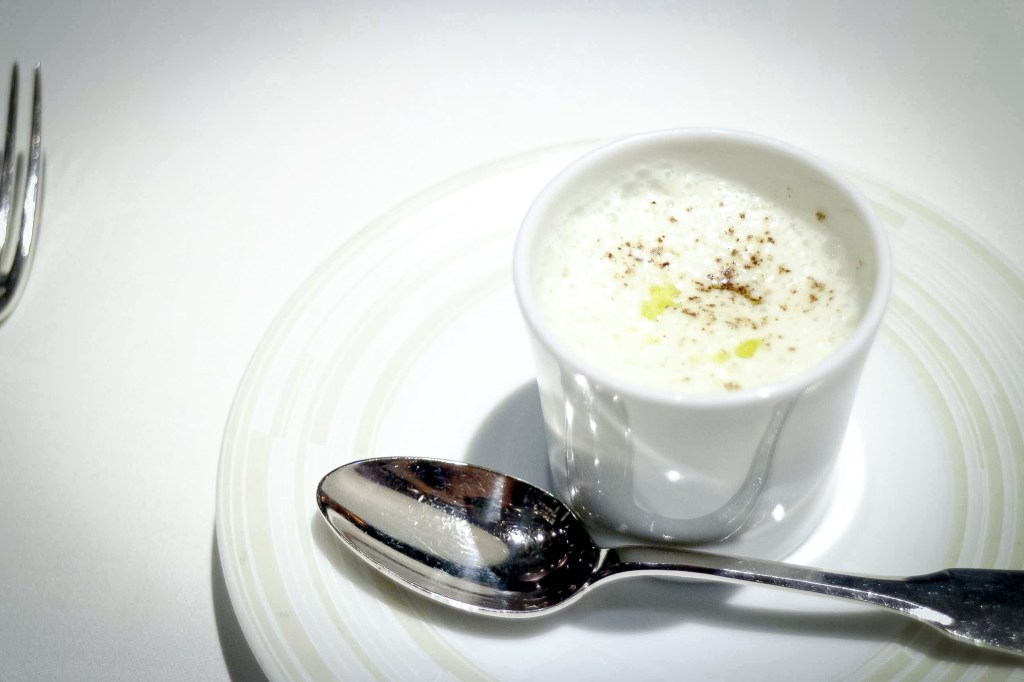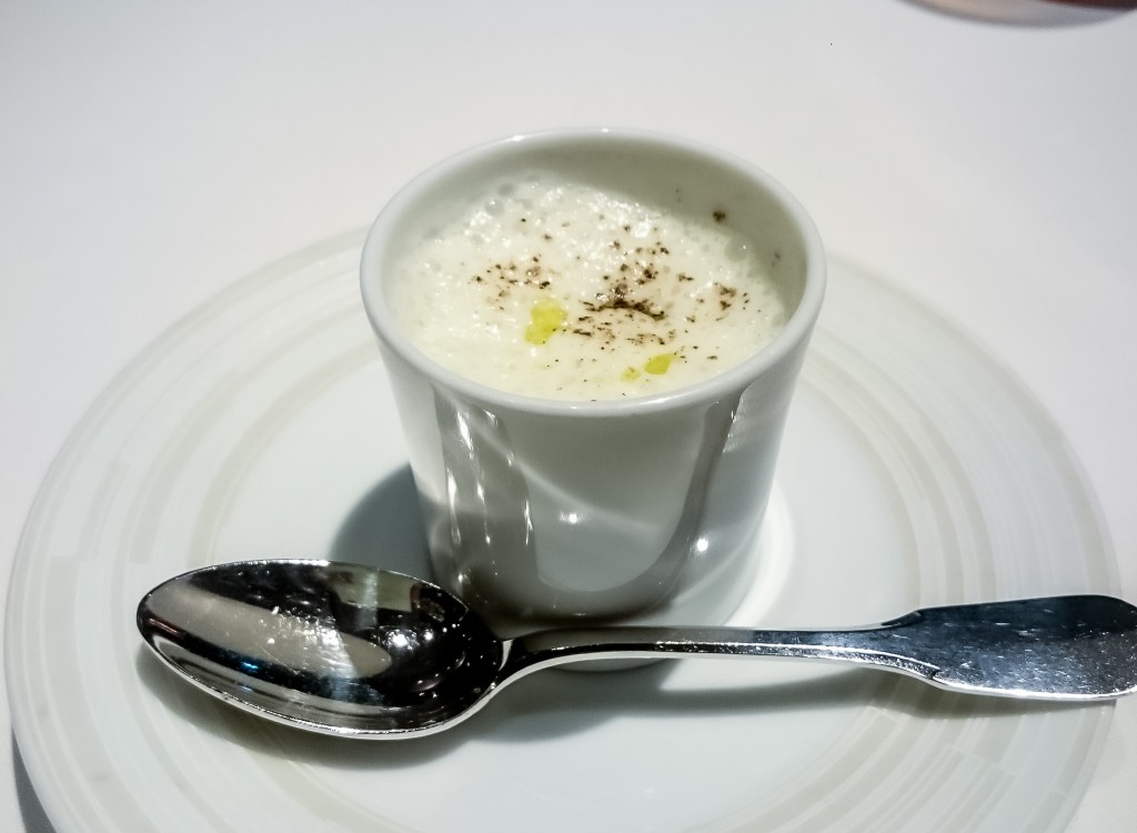 好的,說菜一定是餐廳基本自我要求,眼前的客人吃什麼,喝什麼,都有告知的必要,我想就是我喜愛這類餐廳的因素吧,儘管是湯品也一樣,今天的第3道料理是湯品「根莖植物奶油濃湯」。