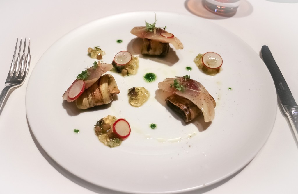 用完了濃湯,接下來就是今天的菜餚,第4道是前菜第一種「茄子鯖魚捲」。