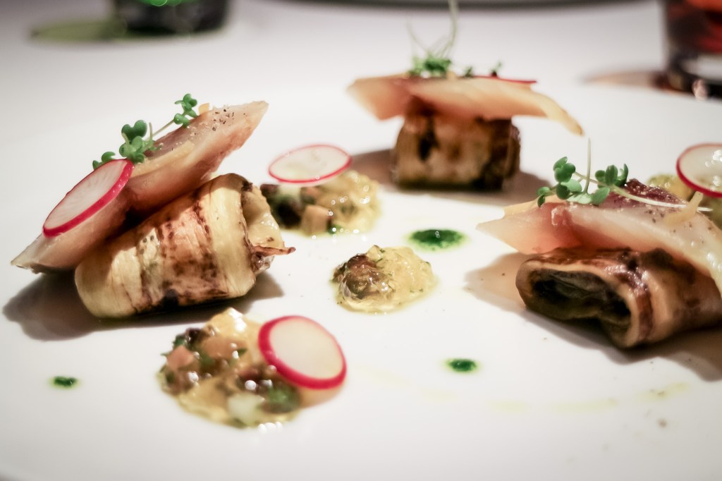 前菜是一道魚料理,採用鯖魚以及茄子涼拌,並且包捲些熟悉的小料理如番茄香的食材、果凍番茄味、青綠的海菜以及些小蘿蔔,很有特色的料理,其中果凍的甜可以去除魚的腥味,十分有趣,驚奇也可口。