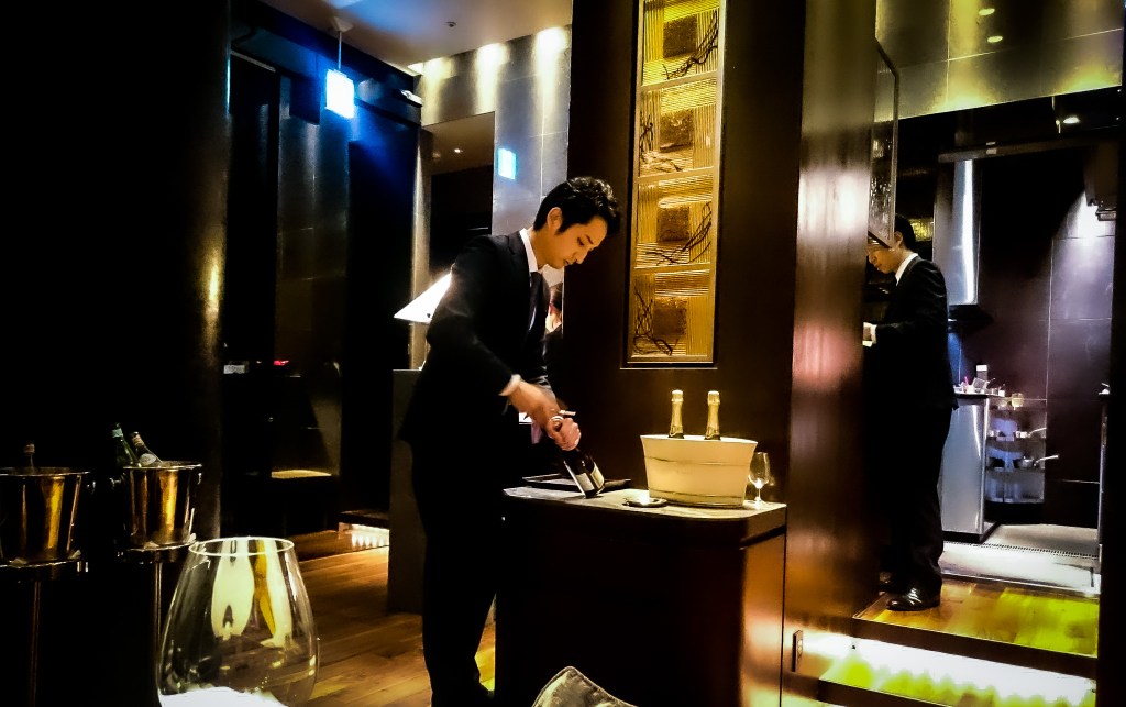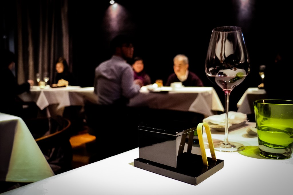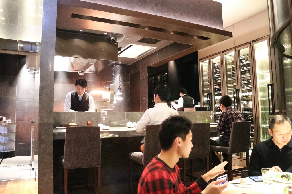 進到餐廳,一樣如高級餐廳的的接待與服務,例如協助脫外套、準備置物櫃等等,十分周到,讓人感到尊榮。而這天,來此用餐的客人也是陸續於用餐時間進入,嚴格來說應該是一波滿座的狀態。不過,在日本餐廳用餐可以發現,桌桌有紅酒誒。的確,這與臺灣飲食文化有相當的差異,迄今臺灣雖稍有改變但大多數人,仍不會喝葡萄酒。