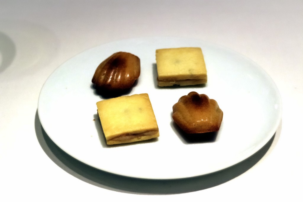 好的,品完葡萄酒,今日的餐點也將陸續上桌,而服務人員帶來的第一道是一塊小點心,這是一款「瑪德蓮與奶油餅乾」。