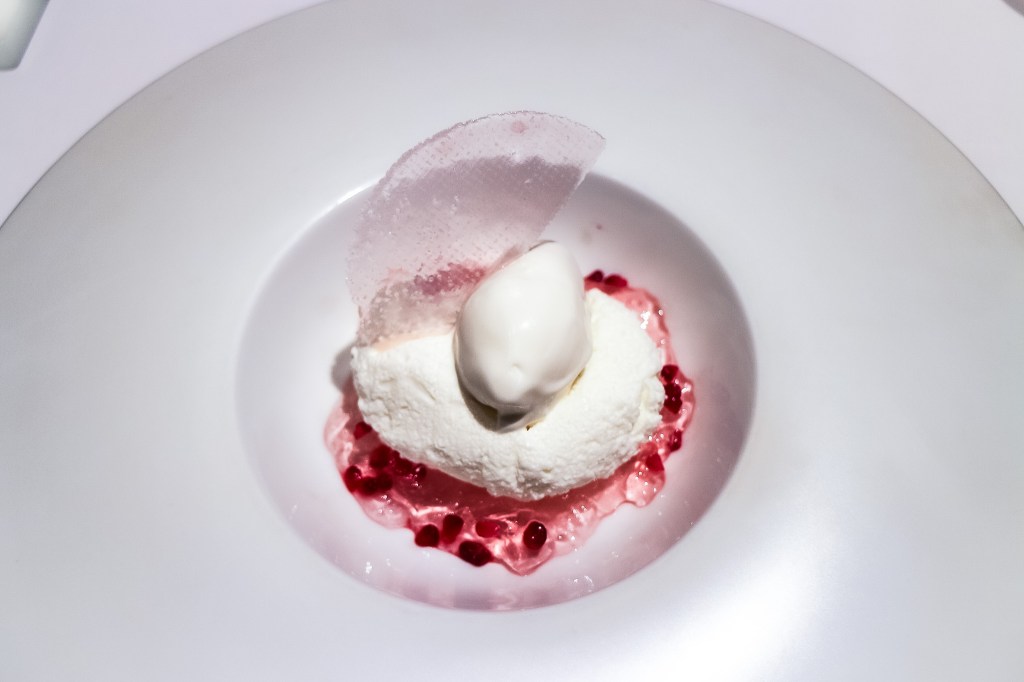 餐後甜點是有點冬季戀歌的感覺奶油牛奶冰淇淋,這是用燒糖、奶油及牛奶冰淇淋為主的甜點。感覺日本的餐廳喜歡用Jelly來表達一些料理概念,這讓甜點有滑順香甜的口感滋味,當然還有梅果的酸甜,但是儘管料理能表現現在氣候的風格,但整體來說口感味覺有些單調。