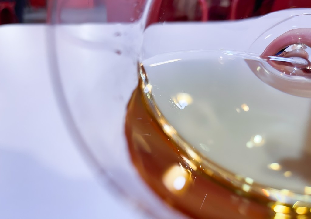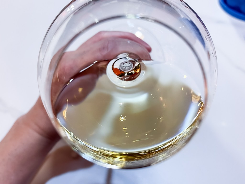 再自細觀察,它從酒緣開始逐漸從黃檸檬汁清淡到黃檸檬皮等色調,酒面十分乾淨清晰優雅。搖晃酒杯,酒腿在這款通用的Lehmanne帶梗杯中,雖然很難很舒服的看到俐落的酒腿,但是在遍佈酒漬的杯中,仍仔細觀察到酒痕的華麗。