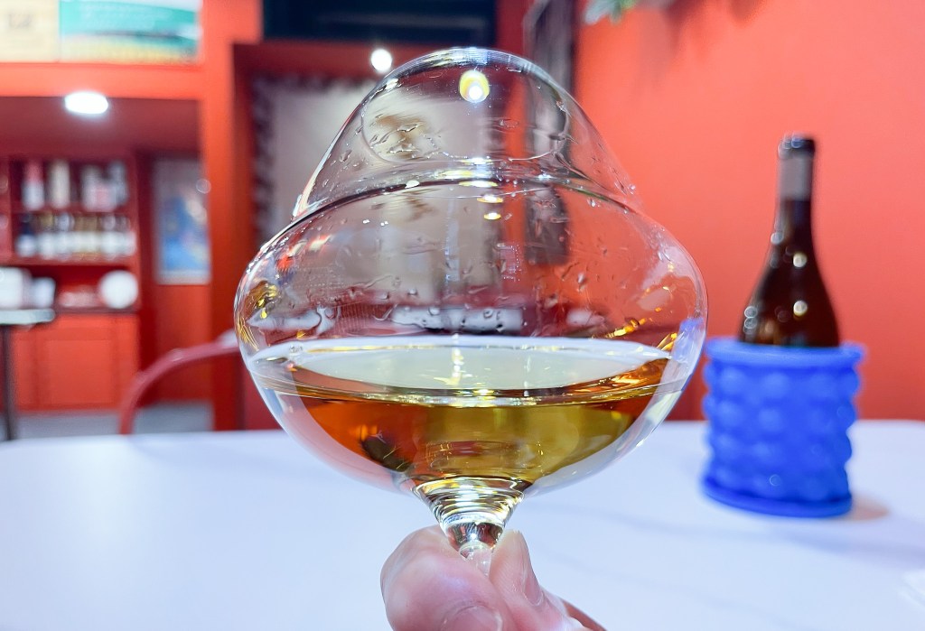 來品飲一下,剛入口時的第一次接觸是十分圓潤、飽滿、感覺像保護膜、膠膜感的樣子,接著夏日水果風味炸裂,水梨、李子、桃子、棗子、這類白肉、脆口、多汁香甜的水果味為主,接著岩礦感,如甘醇炭酸感、一種站在岩石上飄出自然的礦物香,還有的茶味、還有葡萄柚皮味,酒體溫和親近。