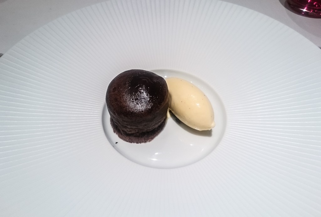 甜點第二道是巧克力熔岩蛋糕,很厲害,這道甜點是我認為近期最令我快樂的熔岩蛋糕,因為太解沒有看見會產生熔岩狀出沒的巧克力熔岩蛋糕了。