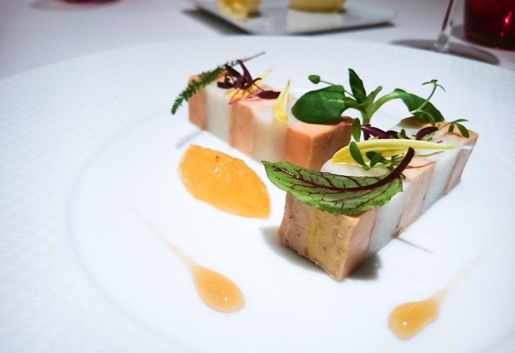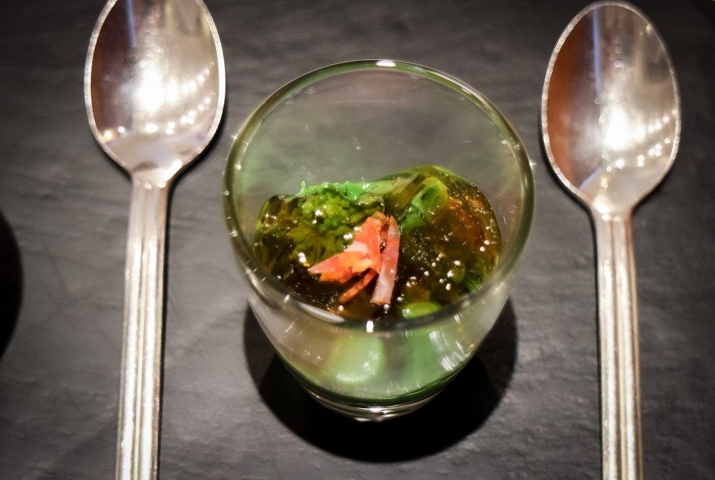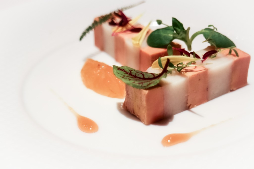 第二道也是以日本在地蔬菜里芋與鴨肝交疊製作的小品,而且在盤邊佐上柚子果醬以及撒上些柚子花與其他香草陪襯。