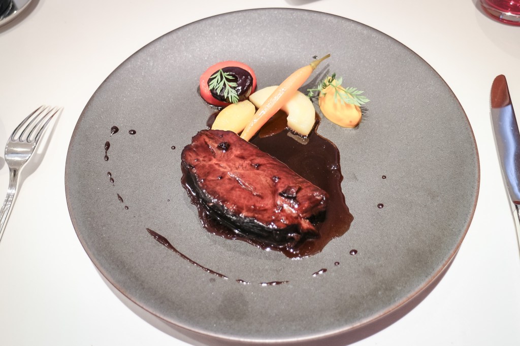主餐是用日本和牛的牛頰肉,搭配南瓜泥、小蘿蔔、小紅蘿蔔、甜菜根,當然還有精心製作而到微甜如蜜汁的牛排醬汁,又十分有照燒風味。